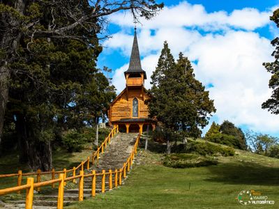 The chapel sits on a raised platform near famous sites like Hotel Llao Llao and Puerto Pañuelo. From this elevated position, visitors have a special view of Lake Nahuel Huapi.