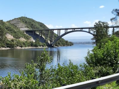 The Governor Jose Manuel de la Sota Bridge spans 325 meters across Lake San Roque, featuring a central arch and two parallel roadways with pedestrian walkways.