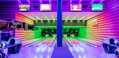 Le Bowling features multiple modern lanes equipped with automatic scoring systems and comfortable seating areas for players and spectators.