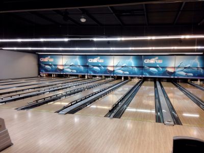 Chorus Bowling features multiple bowling lanes, laser game arenas, escape rooms, and billiard tables within a modern entertainment complex in Normandy.