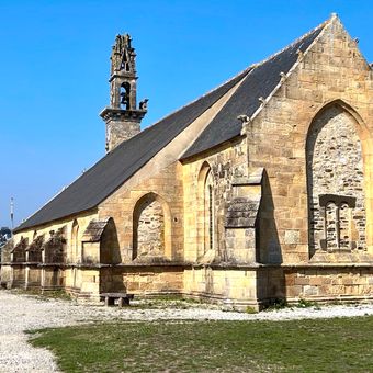 Camping de Gwel Kaer is a campground on the Breton coastline with spaces for tents, caravans, and mobile homes, most equipped with electrical hookups. The site sits on green grounds with direct beach access and views toward Brest harbor.
