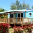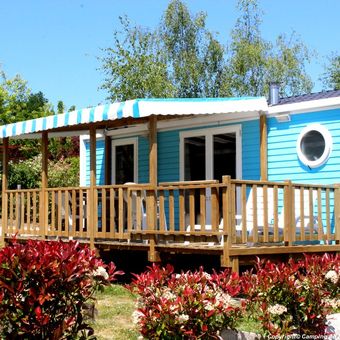 The camping facility features heated indoor and outdoor swimming pools, multi-sport courts, and various types of accommodation including mobile homes and chalets.