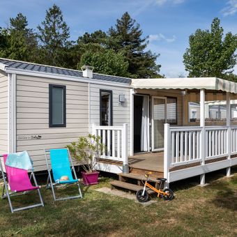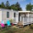 The Domaine des Salins extends across a forested area with 148 pitches, featuring two outdoor heated pools and modern mobile homes for accommodation.