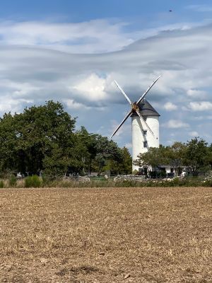 The windmill represents the evolution of rural French engineering, from traditional grain milling to modern renewable energy production methods.