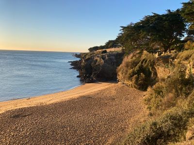 The beach offers direct views toward Noirmoutier Island across the Bay of Bourgneuf, while maintaining its small cove character.