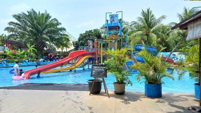 The facility contains multiple pools, water slides, and a dedicated children's area spread across extensive grounds in the Galuh Mas district.