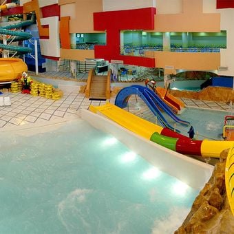 The facility spans 60,000 square meters and contains 63 water slides, indoor pools, wave rivers, and specialized swimming areas for different age groups.