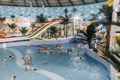 The aquapark contains two swimming pools, seven water slides, a wave pool, and a lazy river spanning across two expansive floors.