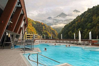 During winter months, visitors can experience the contrast of swimming in a heated outdoor pool while surrounded by snow-covered Caucasus mountains.