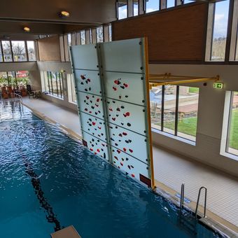 The Hallenbad is an indoor swimming facility in Nordhorn with multiple pools designed for different activities. The complex includes four separate halls, a sauna, water slides, a 10-meter diving tower, and a large outdoor pool that operates seasonally from May through September.