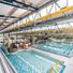 The Freizeitbad Düsselstrand features a 25-meter main pool with five lanes, multiple specialized pools, and three temperature-controlled whirlpools across its 1300-square-meter facility.