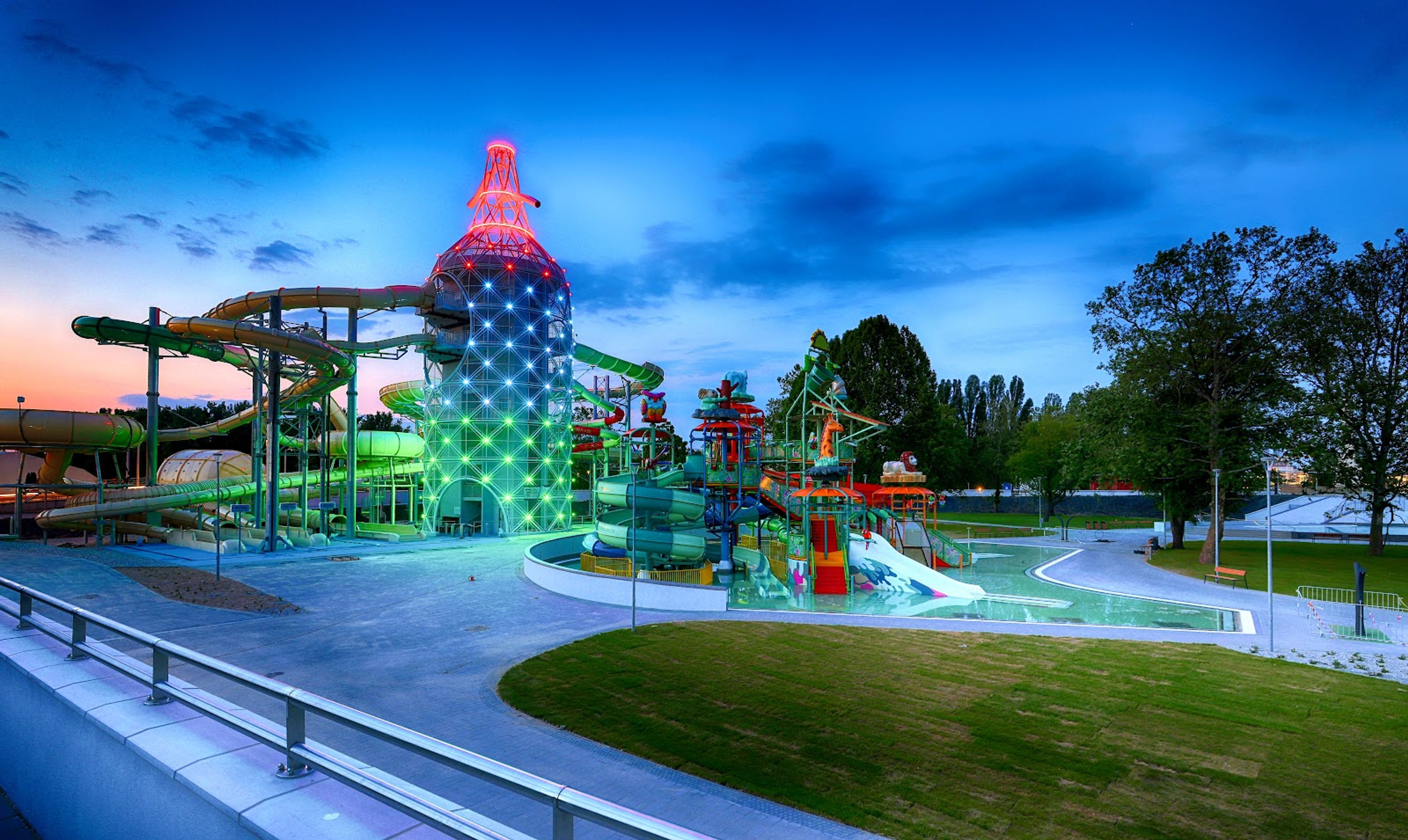 The park contains Hungary's largest thematic spray park and a two-story Japanese sauna world that accommodates 150 visitors simultaneously.