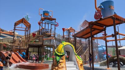 Cactus Springs features multiple water slides, massive tipping buckets releasing 1000 gallons of water, bubbler jets, water wheels, and curtains across several play levels.