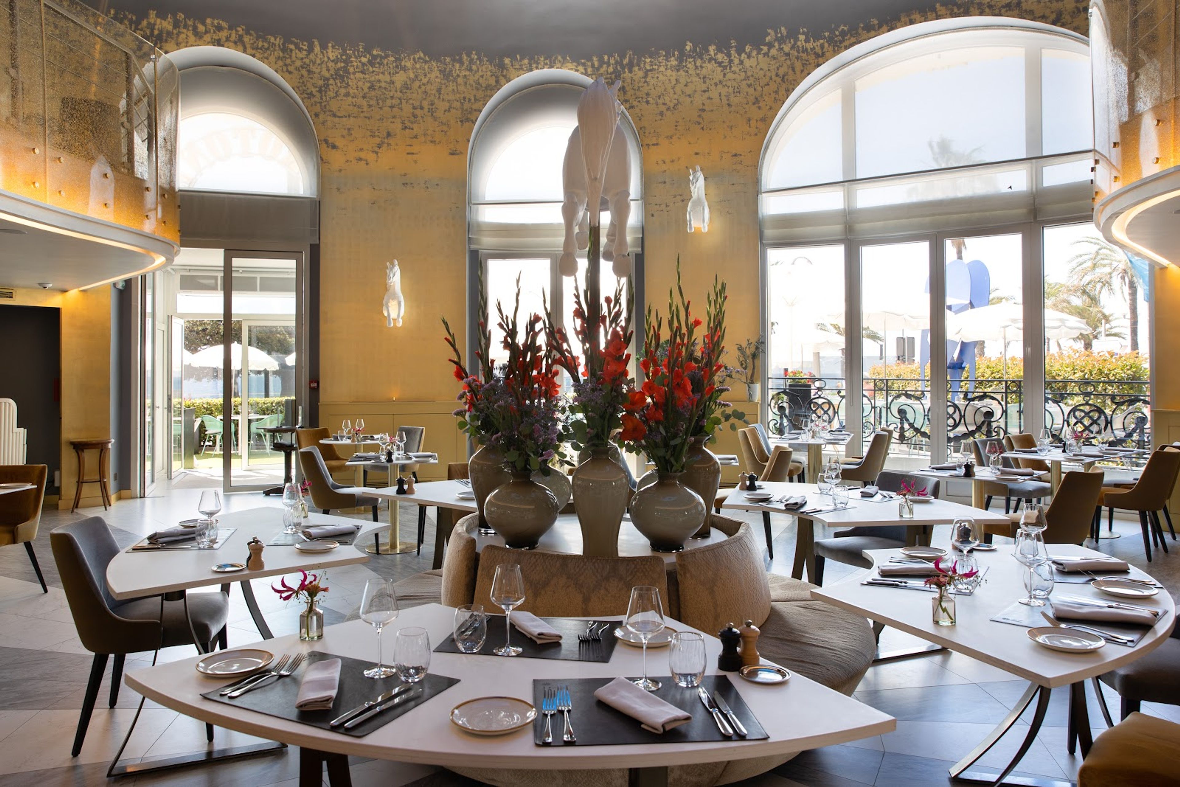 The restaurant features white and gold interior design with large windows offering views of the Promenade des Anglais and Mediterranean Sea.