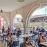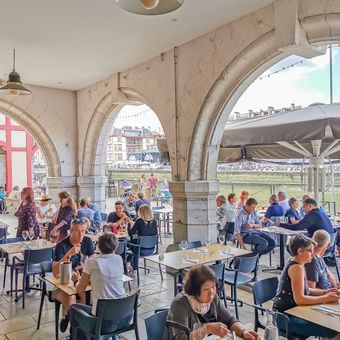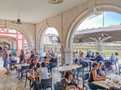 The restaurant features a heated terrace in winter and shaded dining space in summer along the Nive River banks beneath stone arcades.