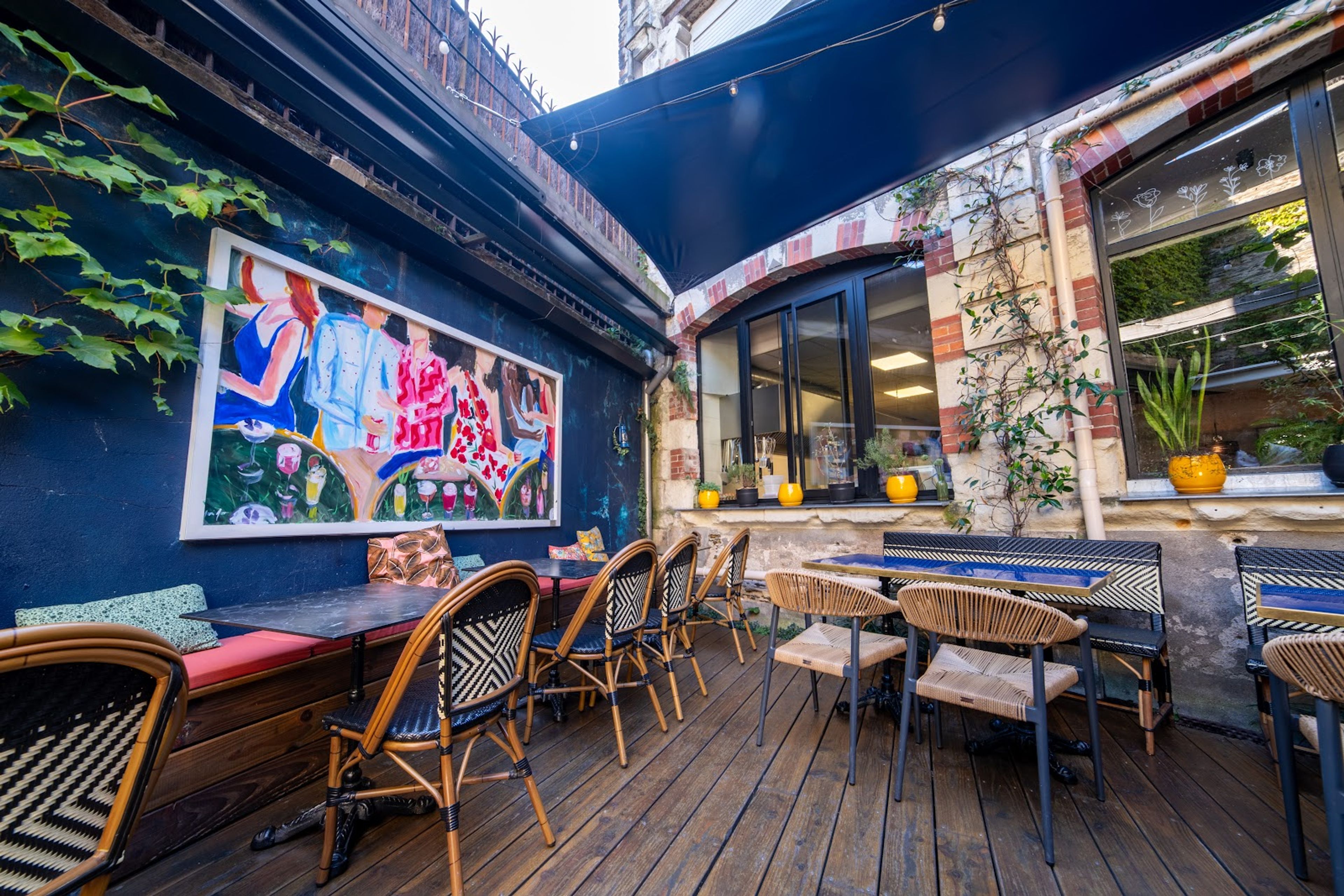 La Cour occupies a spacious setting with a plant-filled courtyard and wooden counter where customers observe cocktail preparation techniques.