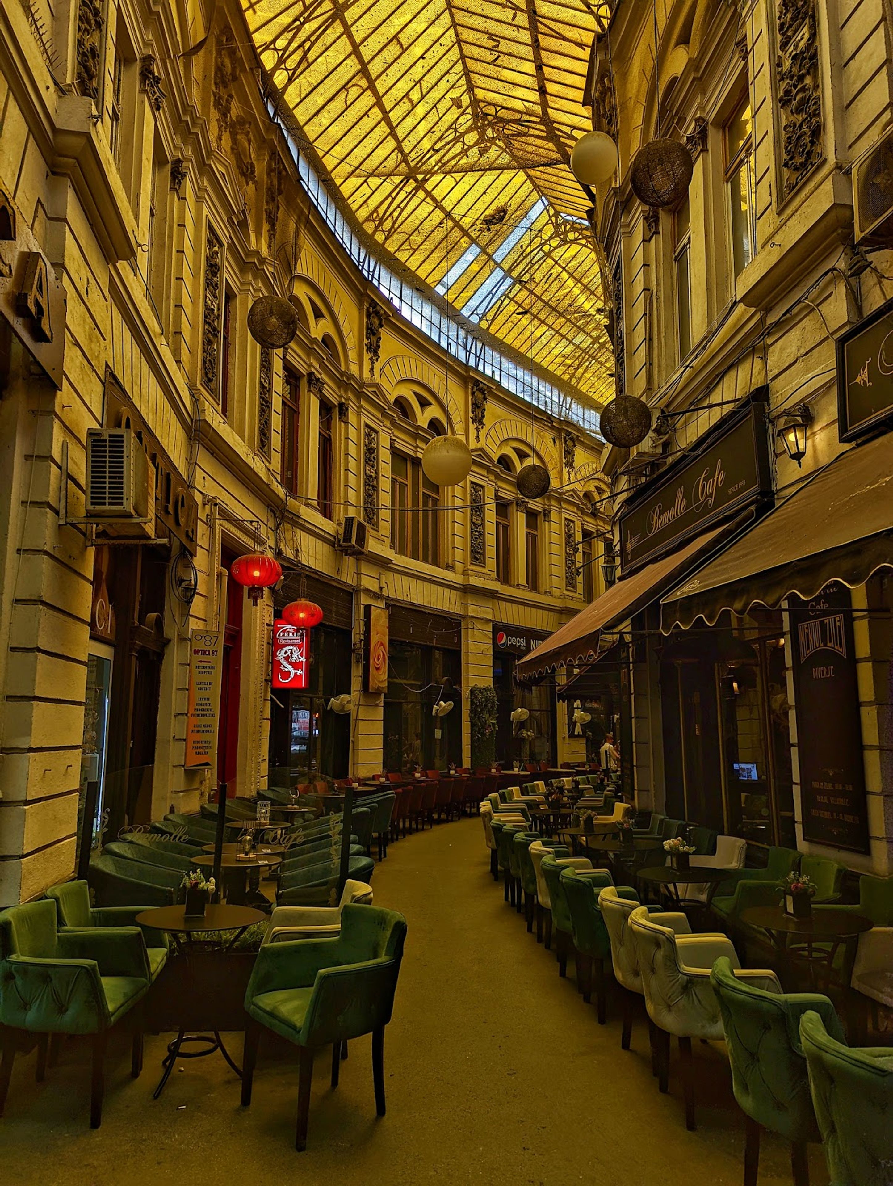 The fork-shaped arcade features a yellow glass roof that filters sunlight through its two branches connecting Calea Victoriei to the National Bank.
