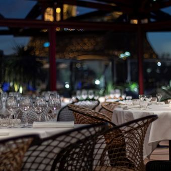 Les Ombres is a restaurant and bar perched on the rooftop of Musée du quai Branly with glass panels providing views of the Eiffel Tower from every table. The space is designed as an open structure that connects the interior with the surrounding environment.
