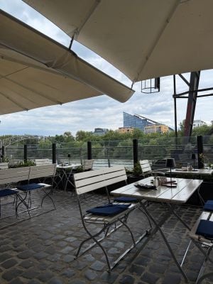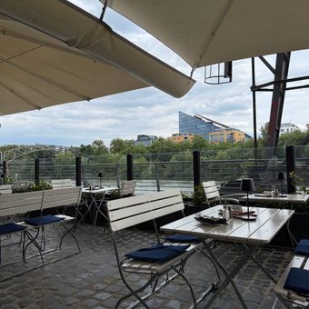 The establishment incorporates an original harbor loading crane into its terrace design, preserving a piece of Frankfurt's industrial maritime heritage along the Main River waterfront.
