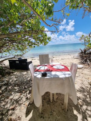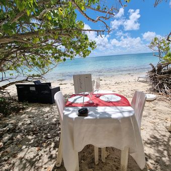 The restaurant specializes in regional specialties like cabri colombo, lambi fricassee, and accras, prepared according to local Guadeloupean recipes.
