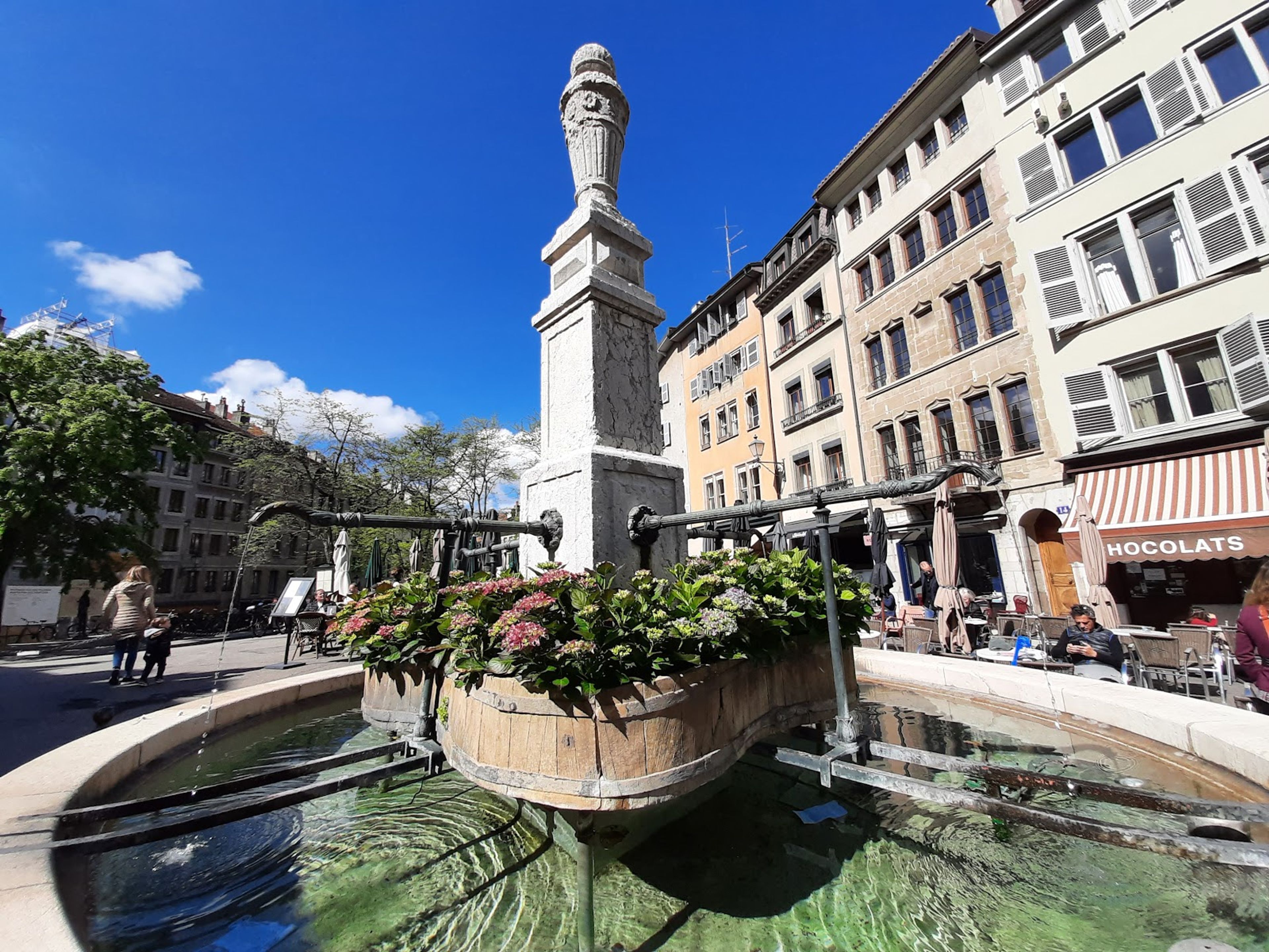 Place du Bourg-de-Four features a marble fountain from the 18th century surrounded by buildings with traditional Geneva architecture and cobblestone pavement.