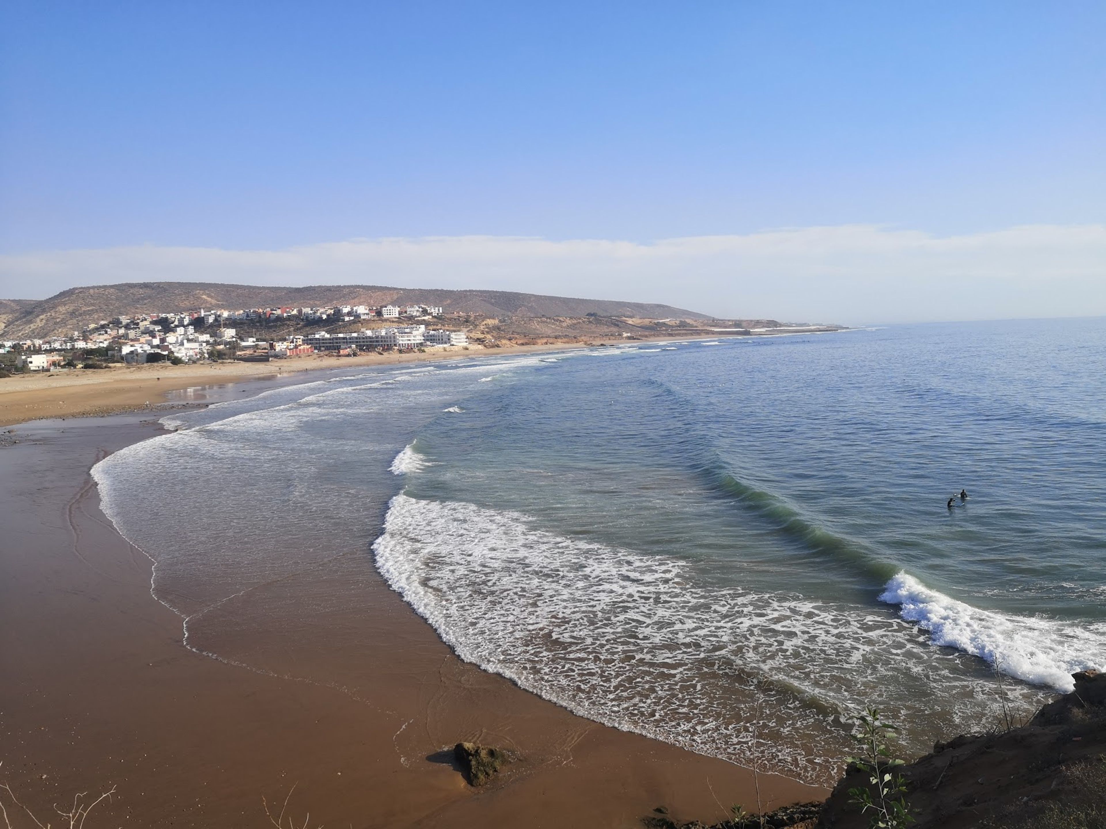The beach is accessible via a 30-minute drive from Agadir, with numerous surf schools and equipment rental shops located along the coastline.