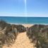 The Petit Sergent beach spans along the Atlantic coast with fine white sand and transparent water surrounded by coastal vegetation.