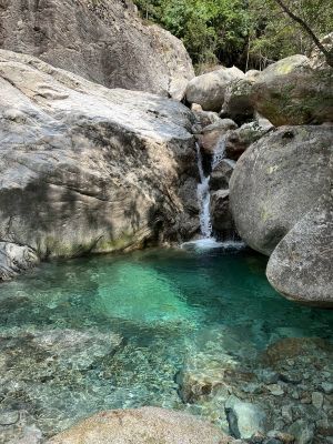 Richiusa is a canyon in Bocognano featuring steep rock walls hollowed by water over time. The formation creates a maze of stone passages and small water pools scattered throughout.