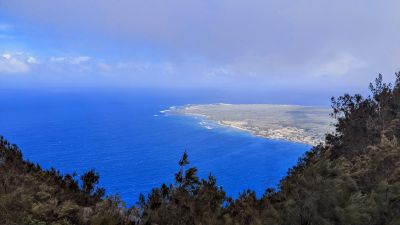 The observation point sits atop steep cliffs on Molokai island, offering views of the Kalaupapa Peninsula and the Pacific Ocean across 2000-foot drops.