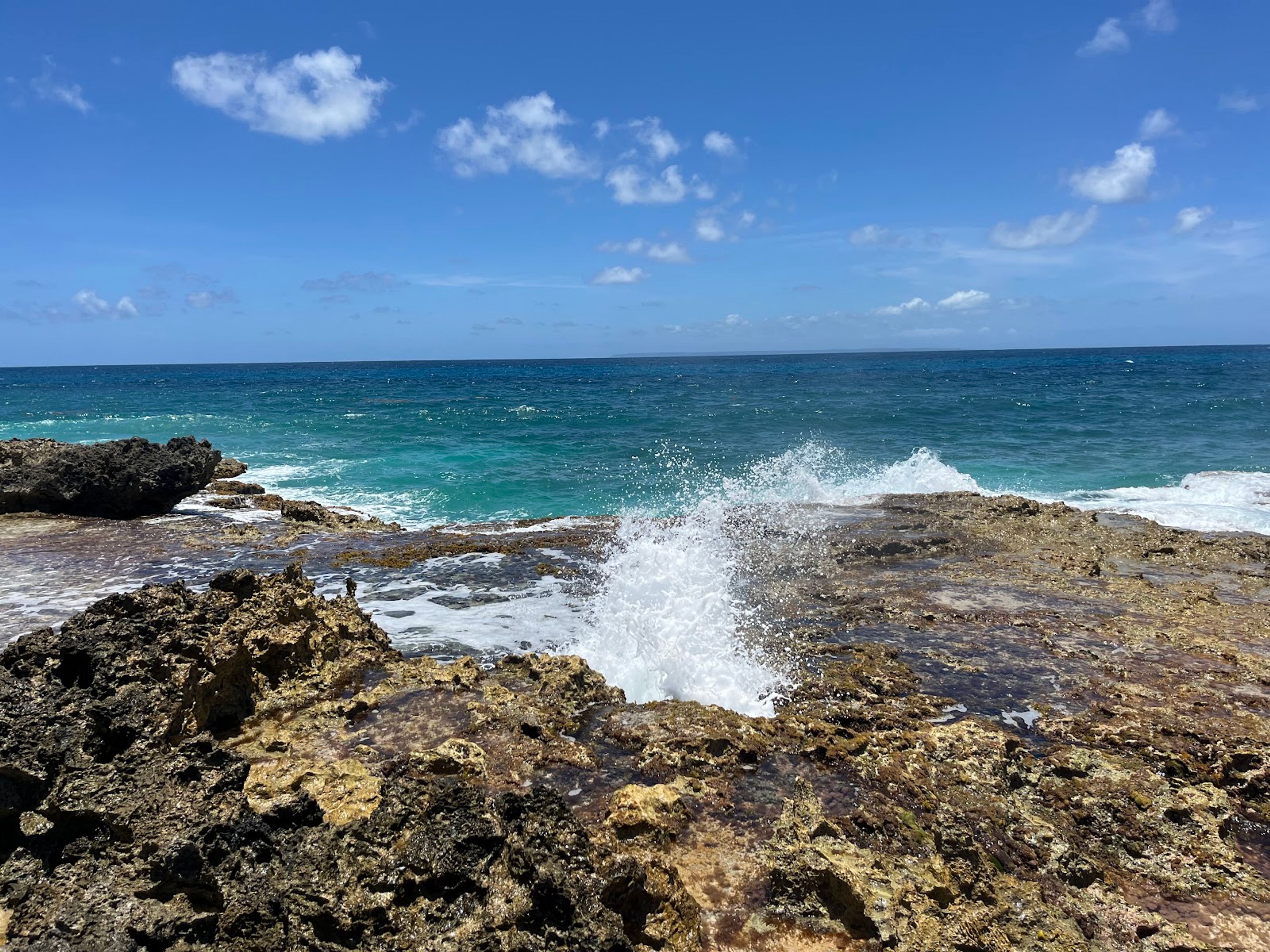 The beach features natural stone pools where ocean waves create geyser-like water sprays, providing a natural shower experience in the Caribbean Sea.