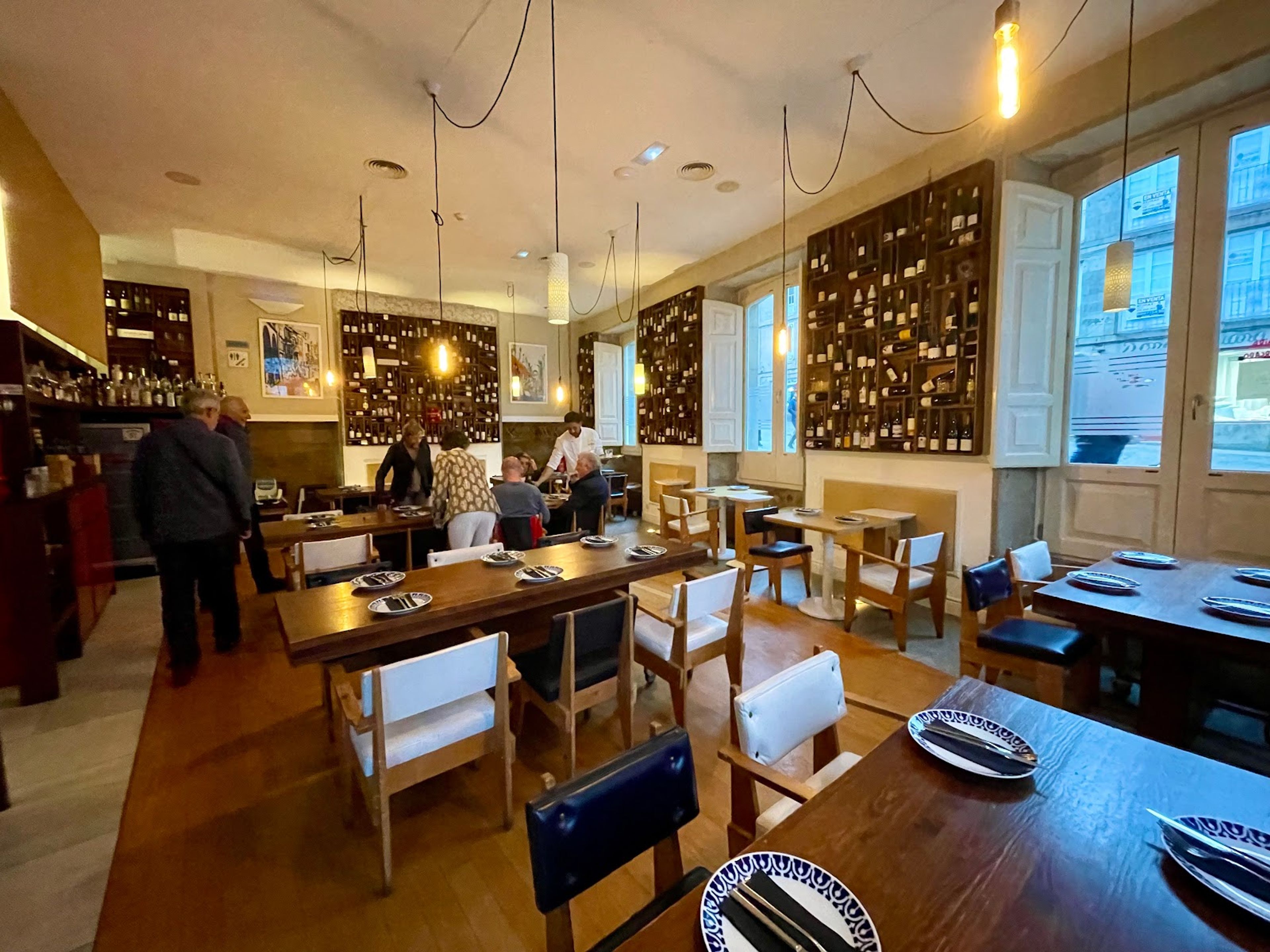 The interior of Café de Altamira features suspended light bulbs, bottle racks, and distinctive Sargadelos tableware against stone walls and wooden elements.