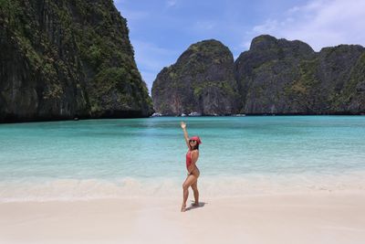 The crescent-shaped cove contains pure white sand beaches surrounded by steep limestone cliffs that rise directly from emerald waters of the Andaman Sea.