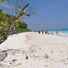 The island features white sandy beaches extending along its coastline, with transparent waters revealing extensive coral formations beneath the surface.