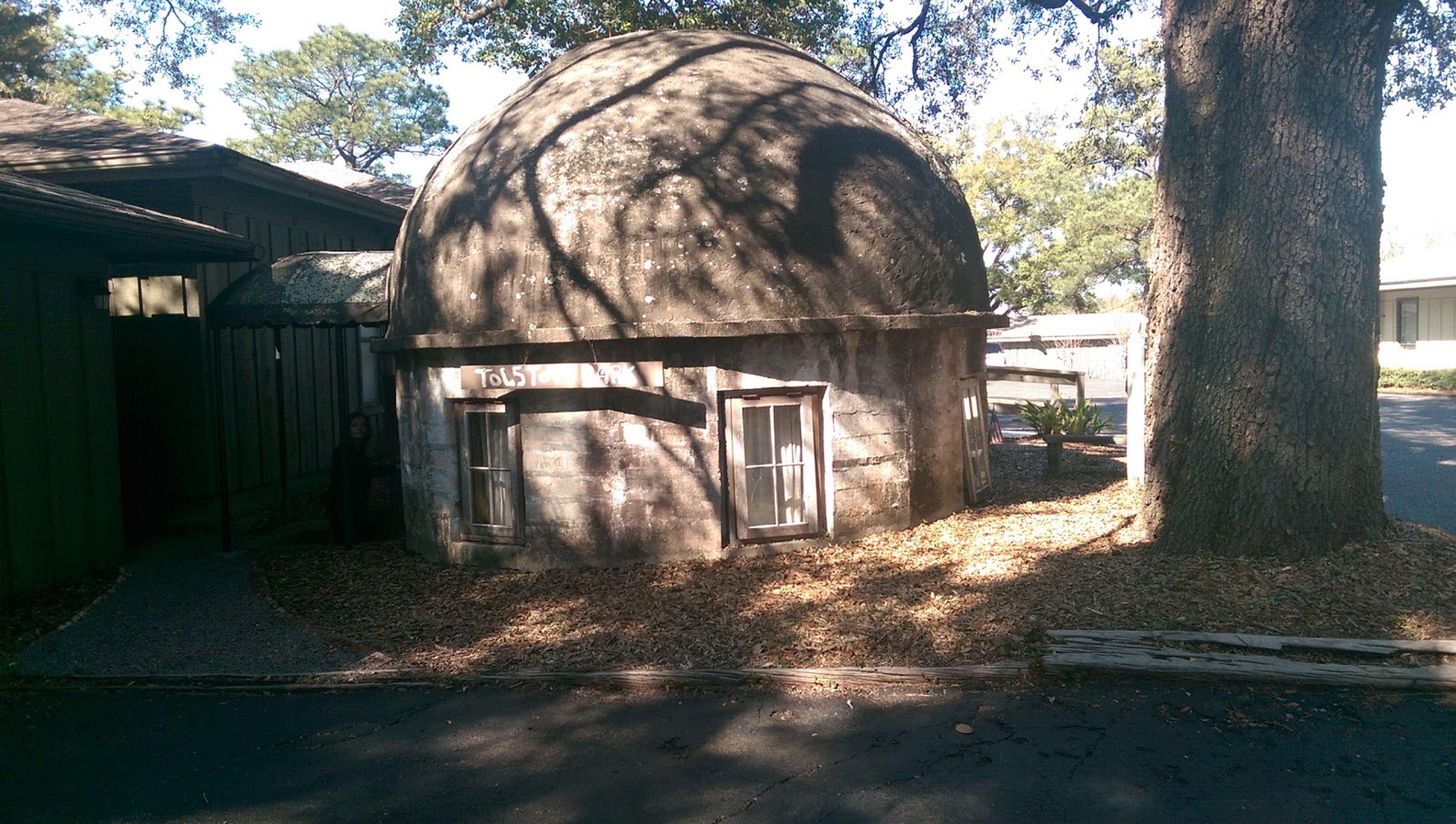 The Henry Stuart House features a 14-foot diameter concrete dome structure with six windows encircling the building and two roof skylights.