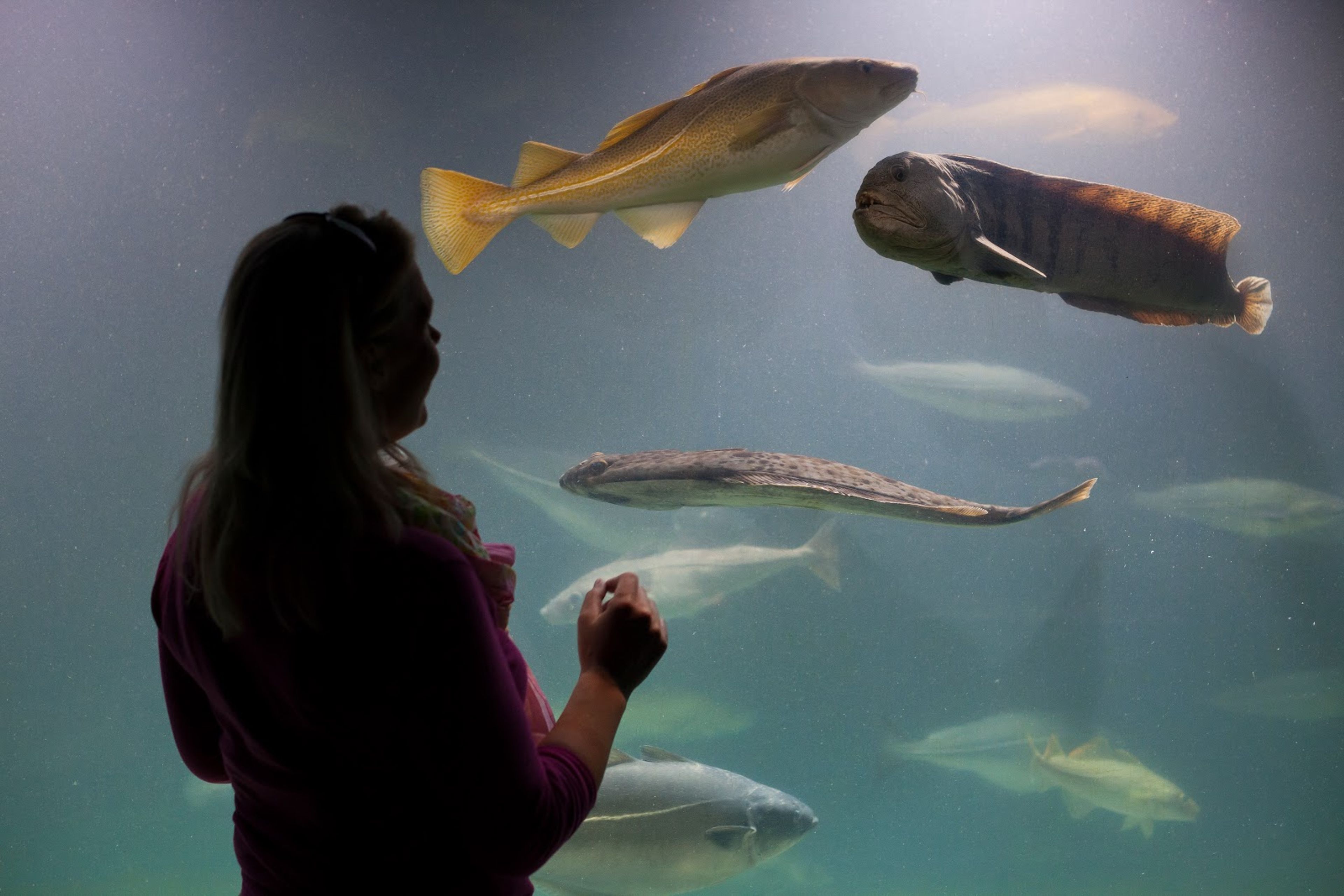 The Lofoten Aquarium displays local marine species in large tanks, including Northeast Arctic cod, crustaceans, sea cucumbers, and other Norwegian sea creatures.