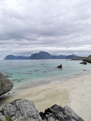 The beach forms part of Flakstadøy island, which has sustained local fishing communities through generations of harsh Nordic winters since medieval times.