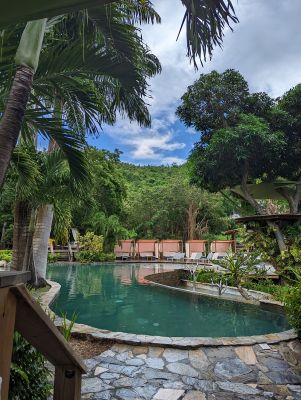 Loterie Farm spans across a tropical forest with hiking trails, zip lines, and a spring-water pool surrounded by abundant local vegetation.