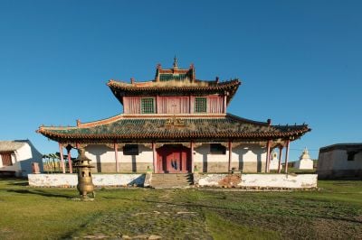 The monastery stands 25 kilometers southeast of Kharkhorin, featuring a central temple with traditional Mongolian Buddhist architectural elements and detailed murals.