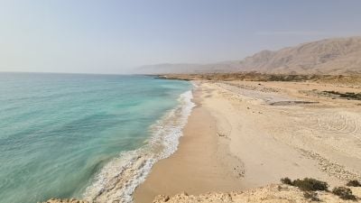 The coastline extends with white sand beaches and pebbled areas alongside turquoise waters of the Sea of Oman, near a fishing settlement.