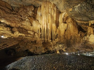 The cave system extends for 5 kilometers through limestone formations, featuring underground lakes, stalactites, and geological structures shaped over millions of years.