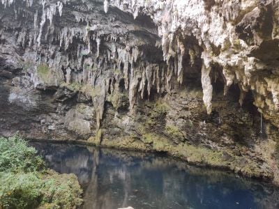 Pethoen Cave contains a large freshwater pool beneath numerous limestone stalactites that form a mineral curtain within the rocky chamber.