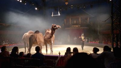 The venue presents traditional circus arts including acrobatics, clowning, and equestrian performances under the direction of Cirque Bormann Moreno.