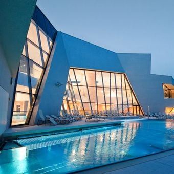 KärntenTherme Warmbad-Villach is a modern thermal bathing complex spanning 11,000 square meters with indoor and outdoor pools, water slides, saunas, and wellness facilities. The grounds combine different water zones, from a 25-meter sports pool to heated outdoor areas and dedicated spaces for children and adults.