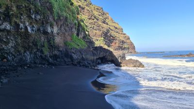 The 450-meter-long beach features black volcanic sand and cliffs, bordered by the Atlantic Ocean on the northeastern coast of La Palma.