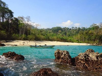 The beach serves as a central fish trading hub for surrounding villages, with numerous fishing boats docking along its shoreline.