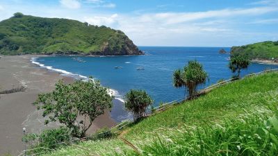This black sand beach stretches along the eastern coast of Java, featuring natural rock formations and multiple elevated viewpoints for coastal observation.