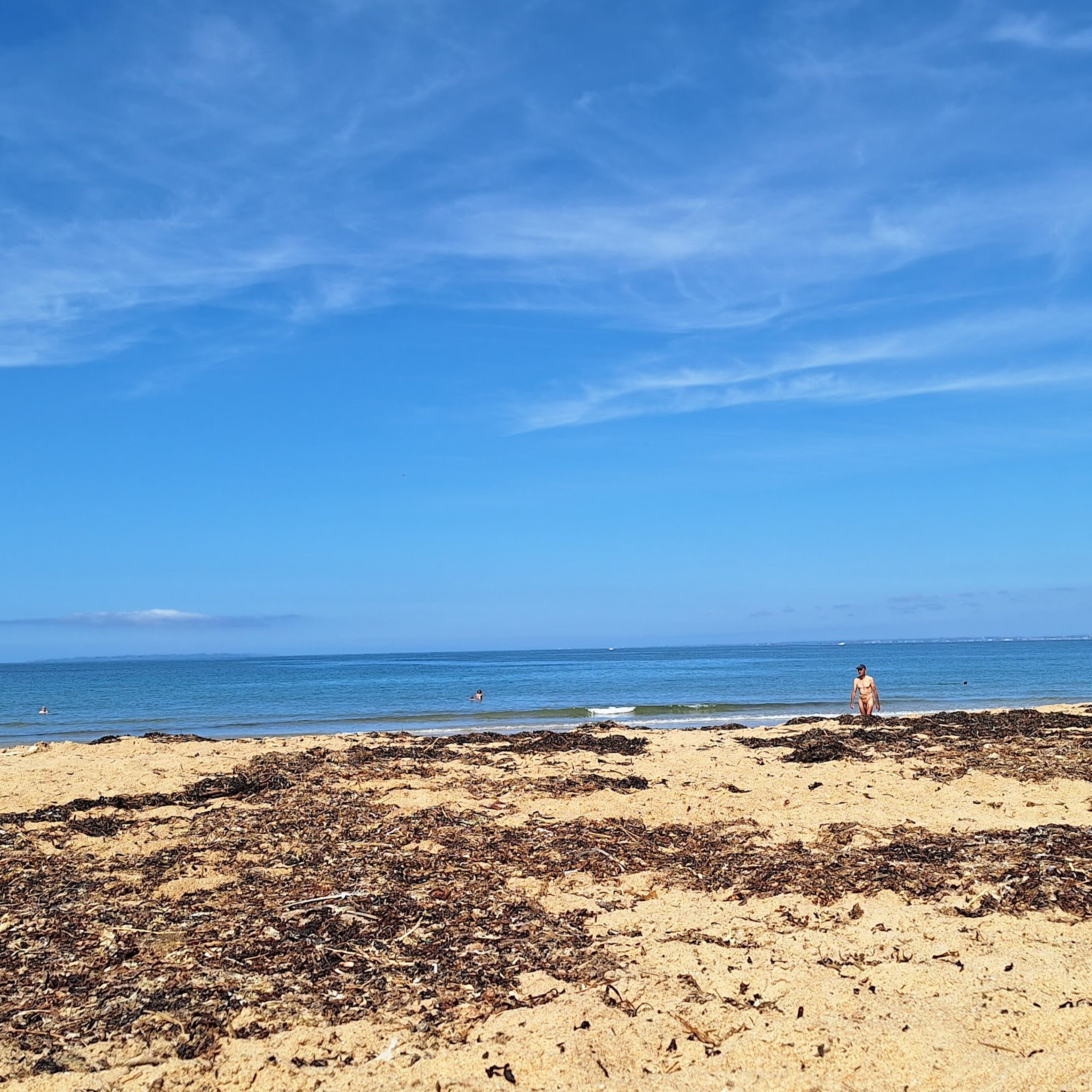 The beach extends along the coast with natural sand dunes, offering separate zones for naturist activities and regular beachgoing near the Etel River mouth.