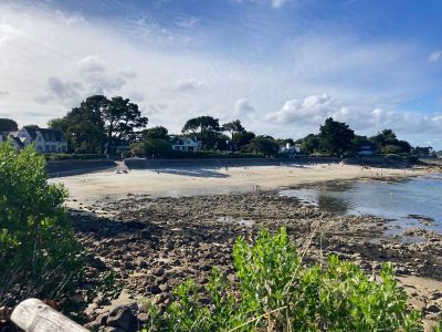 The beach stretches along the Morbihan coast with a mix of fine sand and pebbles, bordered by grassy areas and natural rock formations.