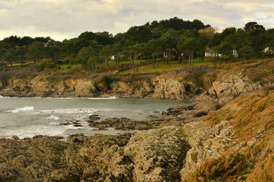 The coastline at Poull Gwenn Gereur features a mixture of sand and pebbles, bordered by natural rock formations along the water's edge.