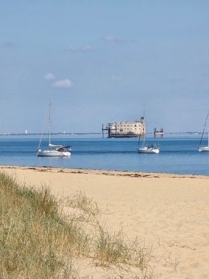 The location provides direct views of Fort Boyard while offering opportunities for shellfish gathering during low tide along the sandy shore.